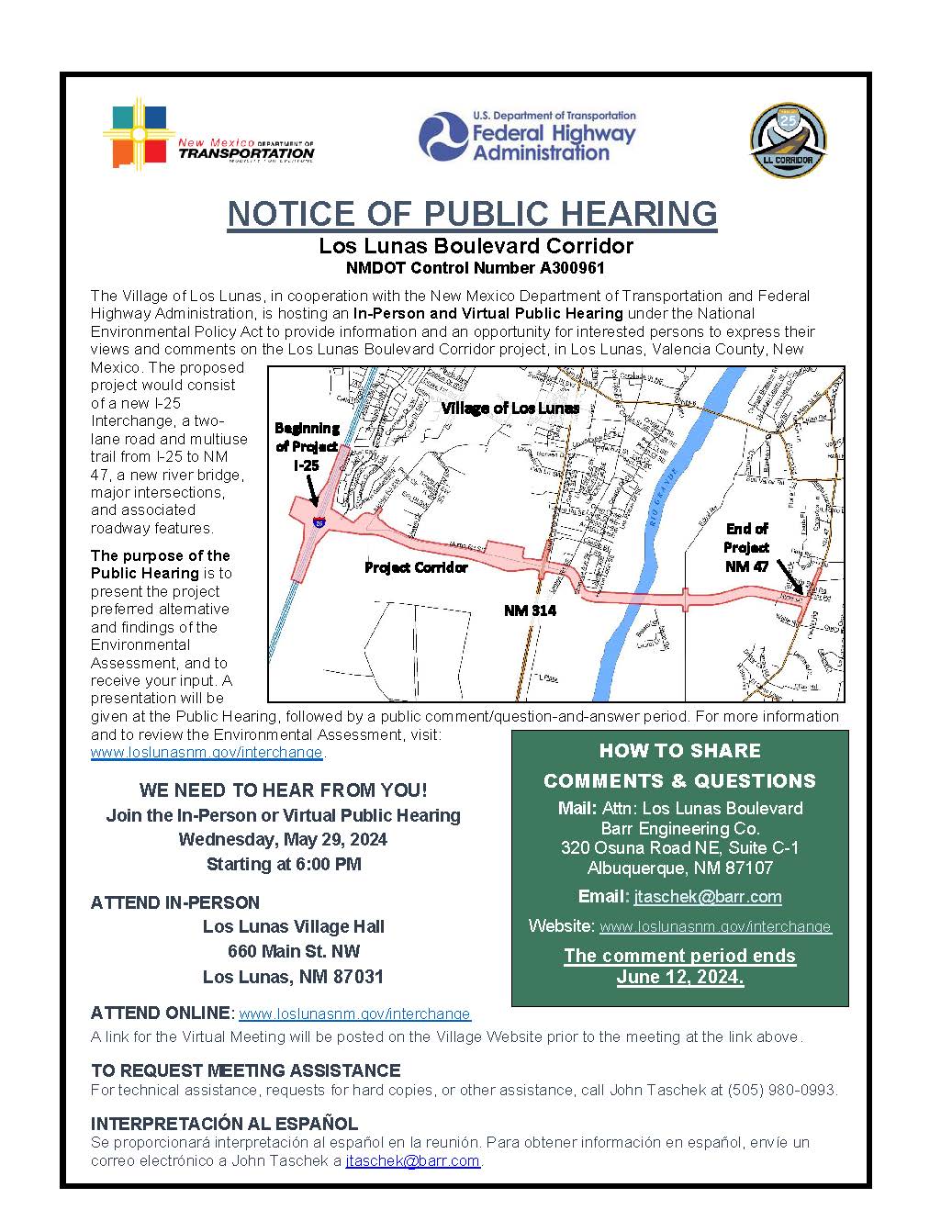 The Village held a Public Hearing for the Los Lunas Boulevard Corridor Project on Wednesday, May 29, 2024. Thank you to all who participated - between our participants in the Council Chambers and those online, we had about 250 total participants!